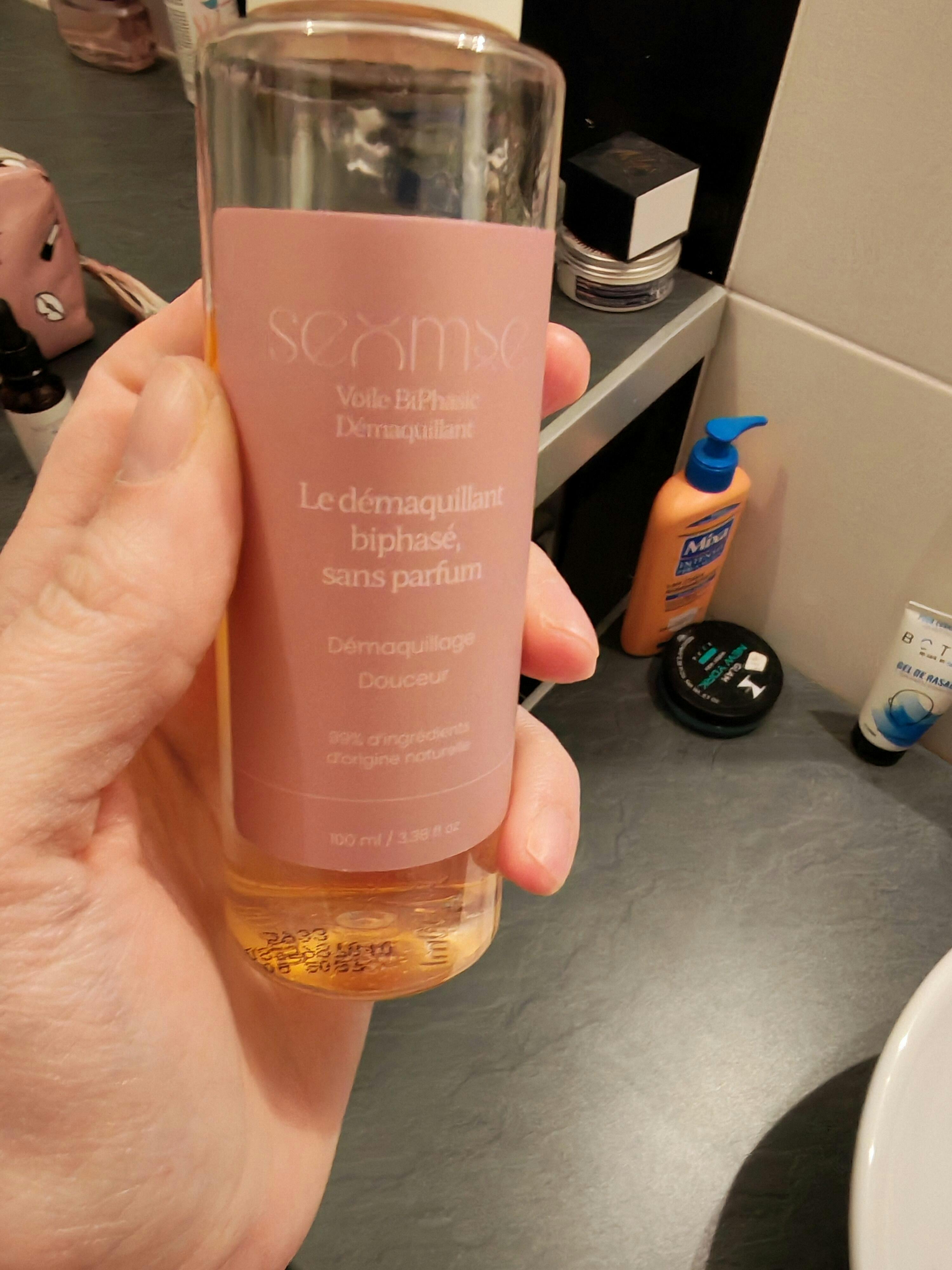 Un démaquillant biphasé (phase aqueuse + phase huileuse) est souvent choisi pour le waterproof. Il dissout mieux certains maquillages tenaces. Secouez, appliquez, posez, puis retirez : simple, net, efficace.